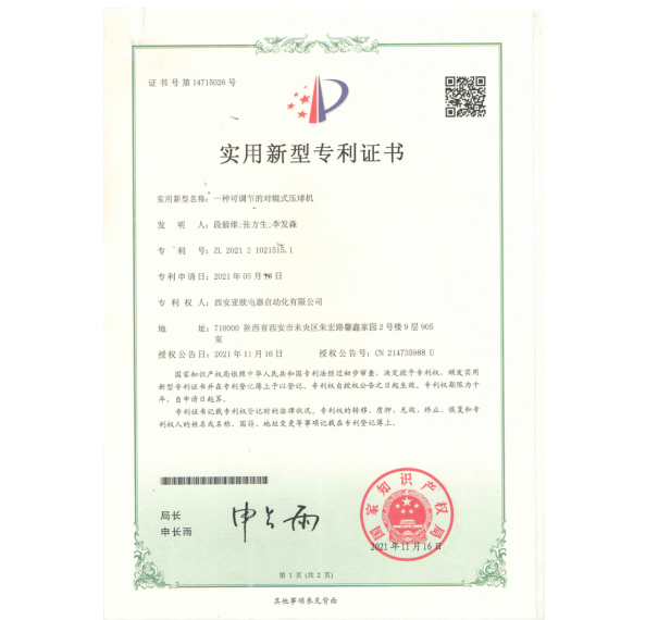 - 關于我們 - 資質榮譽 - 一種可調節的對輥式壓球機